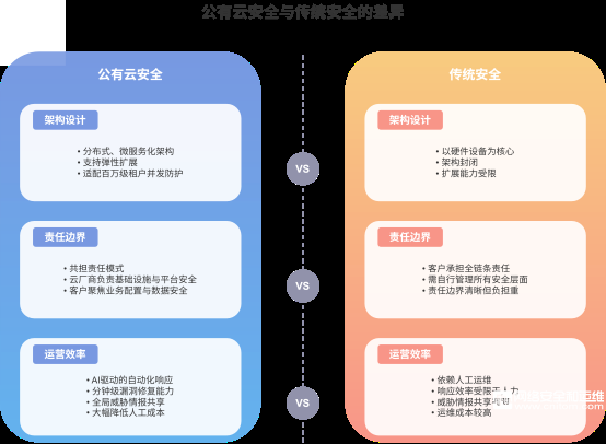 公有云安全通過AI驅動的自動化響應(如分鐘級漏洞修復)、全局威脅情報共享,大幅降低人工成本;傳統安全依賴人工運維,響應效率受限于人力與經驗。