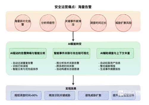 AI可以賦能智能安全事件分析與調查能力。包括一是AI驅動的告警降噪與智能分類,AI自動過濾重復、已知誤報,并根據告警特征和上下文智能分類、分配優先級。二是具備智能事件關聯與攻擊鏈可視化能力,AI利用圖分析技術,將來自不同系統、不同時間的告警片段關聯起來,自動構建完整攻擊鏈圖譜,清晰展示攻擊全貌。三是進行AI輔助調查與上下文豐富,AI輔助調查助手自動拉取相關資產信息、威脅情報和歷史記錄,提供決策建議,并能生成事件摘要報告。