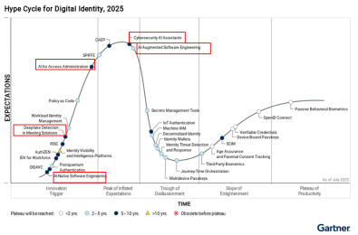 隨著AI技術的廣泛滲透,“AI賦能數字身份”正在成為數字身份管理的重要發展方向。從Gartner近三年數字身份技術成熟度曲線中可以看到,自2024年開始,在不斷迭代AI驅動的新興技術,如:AI增強軟件工程、網絡安全AI助手、Deepfake檢測、AI訪問管理、AI原生軟件工程、身份可視化與智能平臺。其中,AI增強、AI助手、AI原生及AI訪問管理的目標是使數字身份治理更加自動化和智能化,Deepfake檢測是應對“深度偽造攻擊”。
