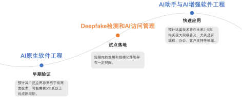 相比之下,Deepfake檢測、AI訪問管理目前還受限于技術水平、特定場景與行業的應用需求,短期內的發展和規模化落地存在一定局限。但調研顯示,這些技術在國內企業中的早期探索已經啟動,并開始試點落地。AI原生軟件工程 是一種新興技術范式,目前該領域仍處于早期技術驗證階段。預計其廣泛應用將滯后于前兩類技術,可能需要5年及以上的成熟周期。