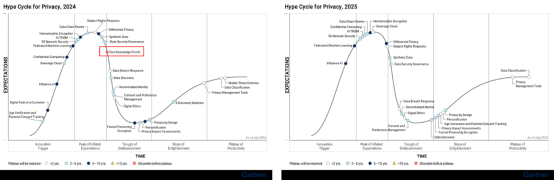 隱私保護(Privacy Protection) 作為一個安全專項,涉及的細分技術類型較多。Gartner采用《Hype Cycle for Privacy》技術曲線對其技術演進進行追蹤。對比2024年,2025年曲線上出現了兩個集中點:一部分相對新興的技術集中到達了“膨脹周期”的頂端;另一部分發展較早的技術開始集中越過了“幻滅周期”的谷底,進入爬升階段;此外,個別技術由于種種原因被取消跟蹤,如ZKP、SMPC。目前整體到達成熟期的技術寥寥無幾。