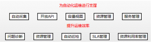 隨著自動化運維理念的普及,以及運維技術的發展,資源管理的方式或方法也悄然“升級”,主要有兩個方面,分別是數據中心的資源管理和應用的資源管理,前者在IT資產管理的功能進行擴充,后者為了更好的為應用數據進行支撐,這兩個方面的核心功能在本質上而言,都是自動化運維推進或落地的重要步驟,如下圖所示,通過問題診斷、資源批量管理、自動巡檢、SLA保障和資源利用率管理的方式提升運維的效率,通過數據自動采集、開放API、可視化視圖、資源標準化、服務管理的方式為運維自動化提供支撐。