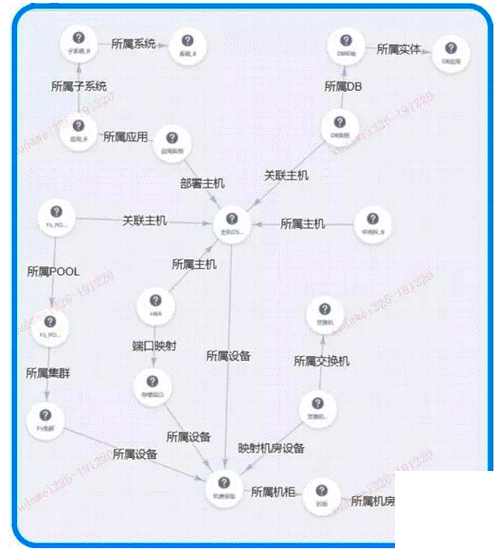 容器云資源數據中,包括了容器云平臺自身的數據,數據中心數據,還包括了面向可靠性保障的事件數據和變更數據,同時也包括面向業務連續性的監控數據、應用配置數據和業務集群數據。作者在此重點分析聚焦在運維領域的數據,如下圖所示,我們可以清晰的看到,機房、機柜、服務器設備、網絡設備、存儲設備之間的關聯關系,也可以看到應用、實體、數據庫、系統之間的關聯,這是一種典型的以IP地址為基礎的數據關聯方式。