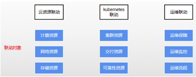 云資源聯動,聯動對象是各類云資源,包括計算資源、網絡資源和存儲資源,主要通過容器云平臺內部的編排功能,達到基礎資源彈性伸縮的能力。kubernetes聯動,聯動對象是kubernetes集群資源數據,主要通過Helm或YAML進行編排。運維聯動,主要面向運維保障、運維監控和運維流程場景,達到自動化運維或智能化運維的能力。