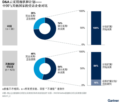 多樣化的云服務提供商(CSP)格局、對數據主權的擔憂和不成熟的D&A云生態,導致了中國整體D&A云采用率相對較低。在2022年底,只有26%的中國受訪者表示已經將D&A資產完全上云,而在其他國家的受訪者中,這一比例為46%(見圖1)。
