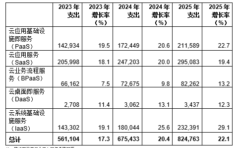 云市場的所有領域預計都將在2024年實現增長?;A設施即服務(IaaS)的終端用戶支出預計將增長25.6%,位居第一;平臺即服務(PaaS)預計將增長20.6%,排在第二位(見表一)。